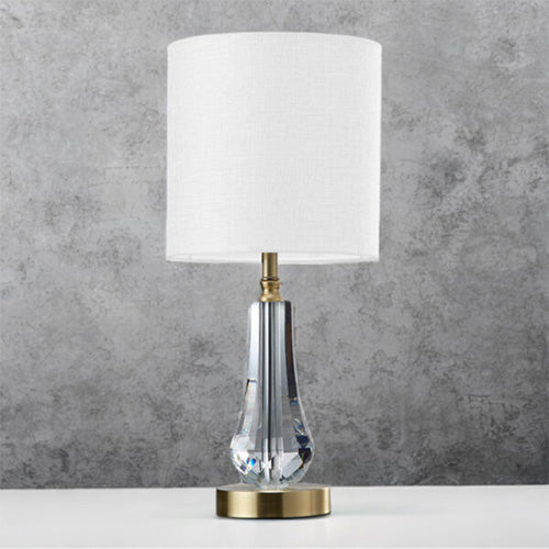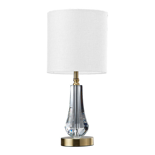 The faceted clear crystal base catches the light from every angle, creating a subtle shimmer that feels luxurious without being over the top. Sitting on a sleek satin brass base, it adds a contemporary metallic edge, while the textured white fabric drum shade softens the glow for a calm, cosy atmosphere.