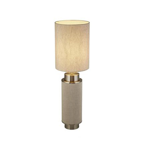 The Flask Table Lamp in Satin Nickel, Grey Hessian, and White Linen is a perfect blend of modern sophistication and natural charm, designed to enhance the ambiance of any room in your home.